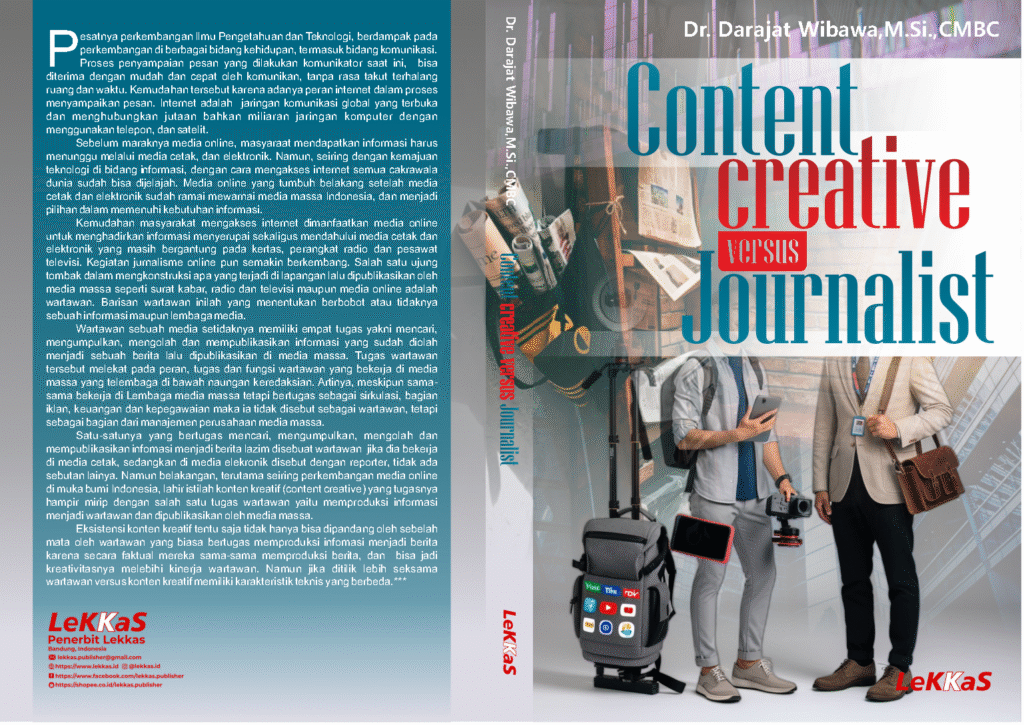 Judul : Content Creative Versus Journalist Penulis :  Prof. Dr. Darajat Wibawa, M.Si., CMBC Sinopsis : Wartawan sebuah media setidaknya memiliki empat tugas yakni mencari, mengumpulkan, mengolah dan mempublikasikan informasi yang sudah diolah menjadi sebuah berita lalu dipublikasikan di media massa. Tugas wartawan tersebut melekat pada peran, tugas dan fungsi wartawan yang bekerja di media massa